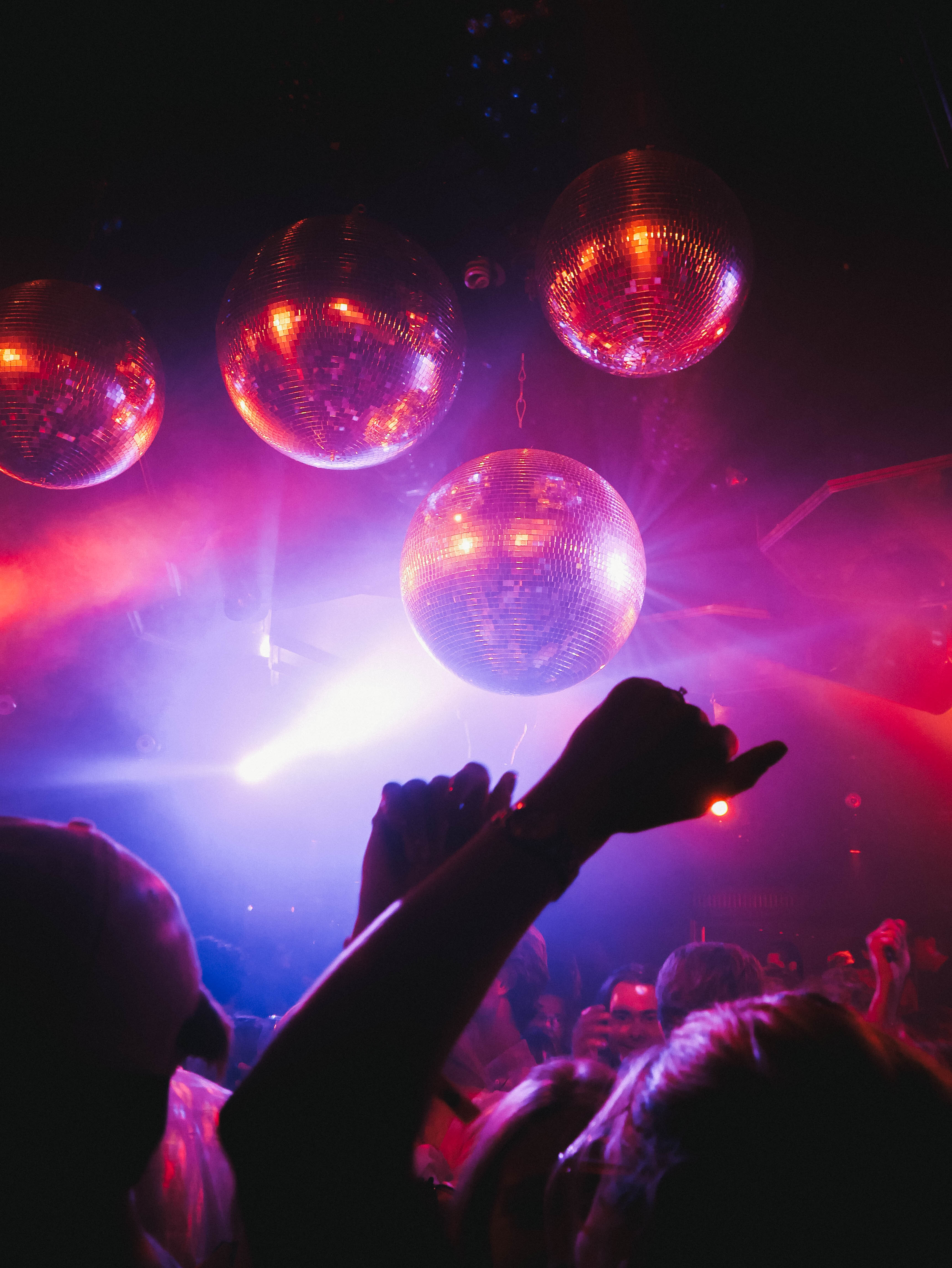 Located in a well-appointed villa surrounded by a landscaped garden area, the club serves as our home base, where most events will be hosted. The venue features a distinct 80s design, welcoming guests with an inviting atmosphere highlighted by mirrors and disco balls that adorn the ceiling. The interior includes elevated platforms and staircases leading to various levels of the dance floor, which is designed with vibrant lighting. The restaurant offers retro seating for meals and drinks, while the garden provides a relaxing outdoor space for guests. This venue combines 80s style with modern elements, creating a unique experience for visitors.